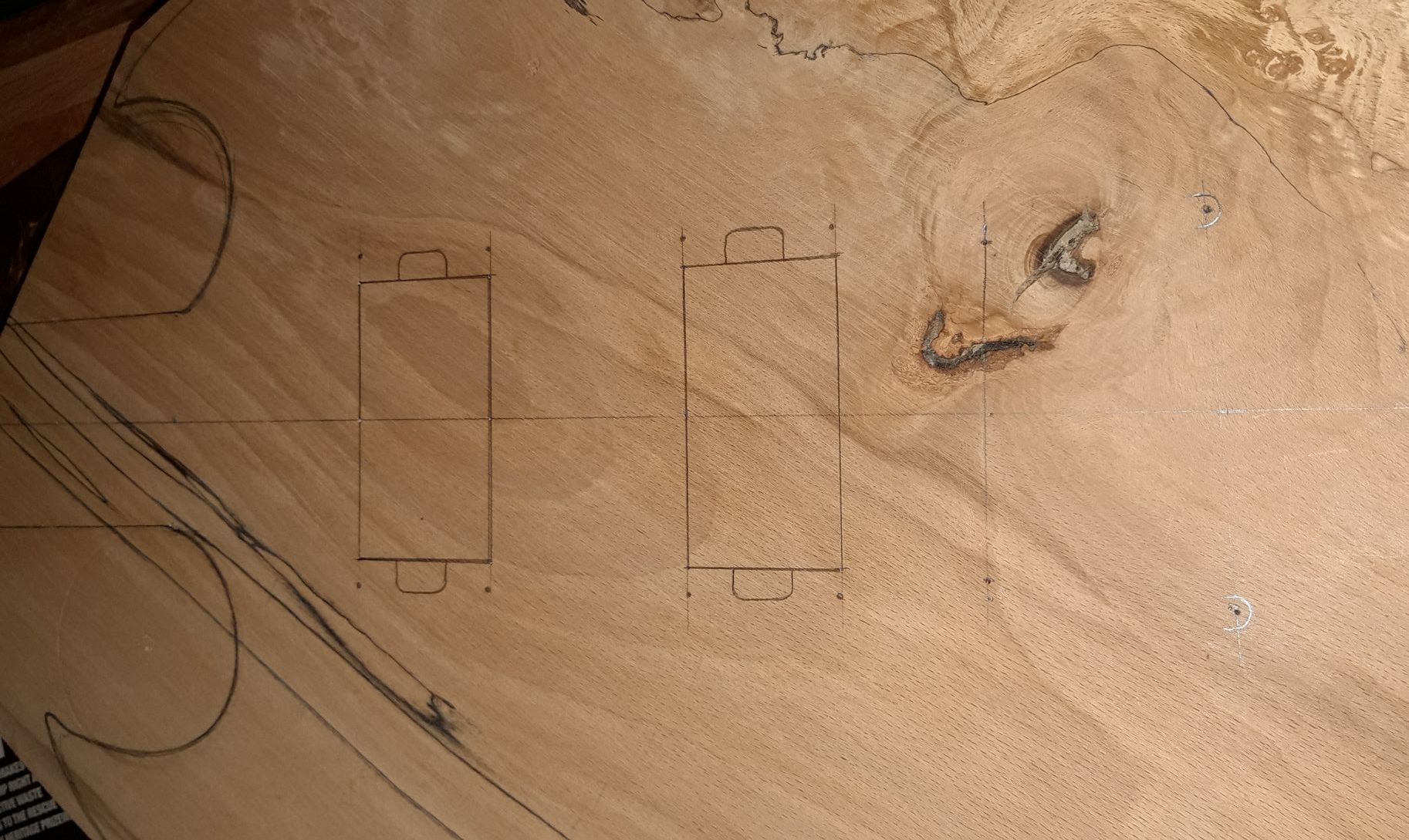 Once scale length, pick-up and bridge/tailstock choices have been made, they can be marked on the centre reference line ready to be cut out.
