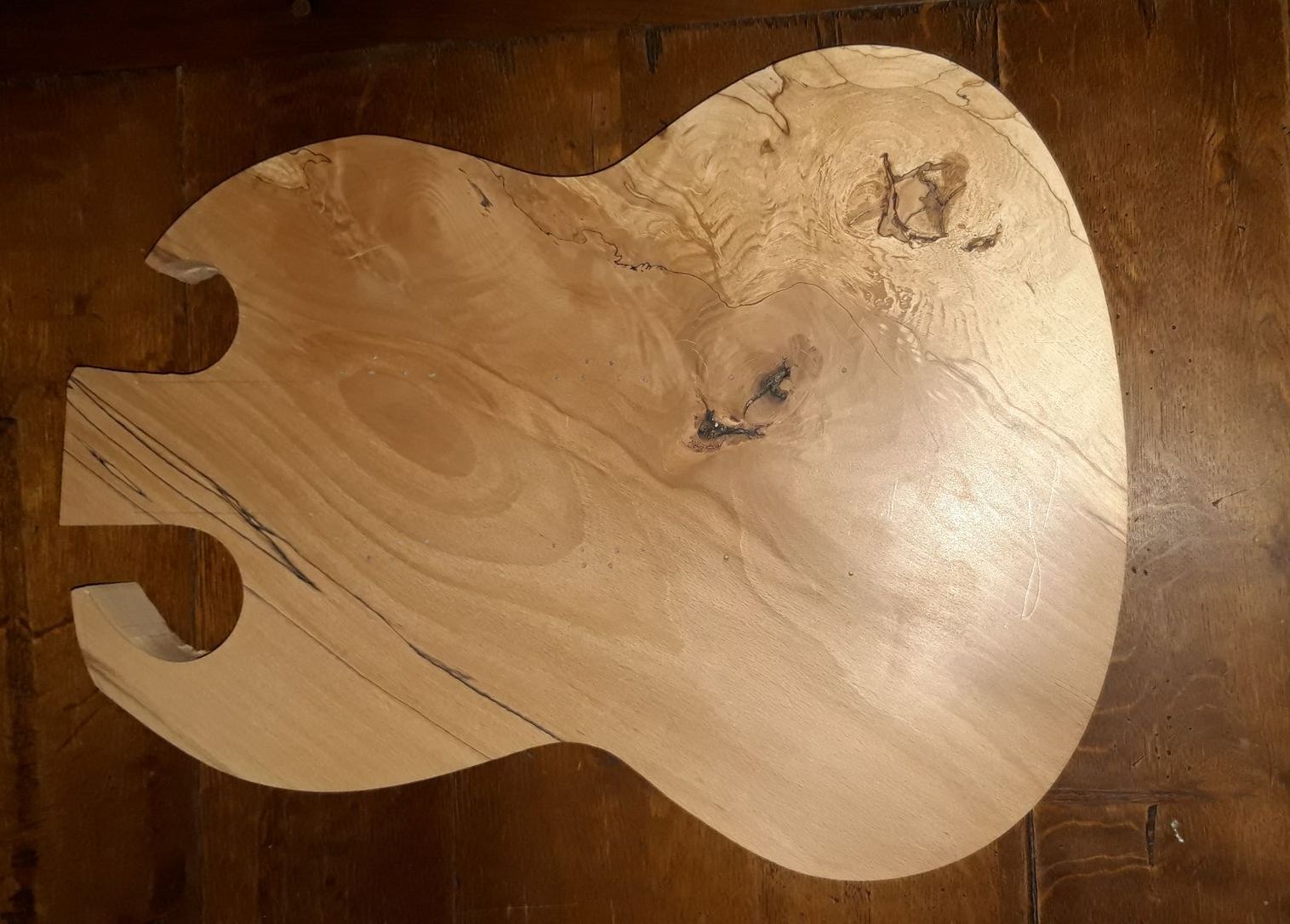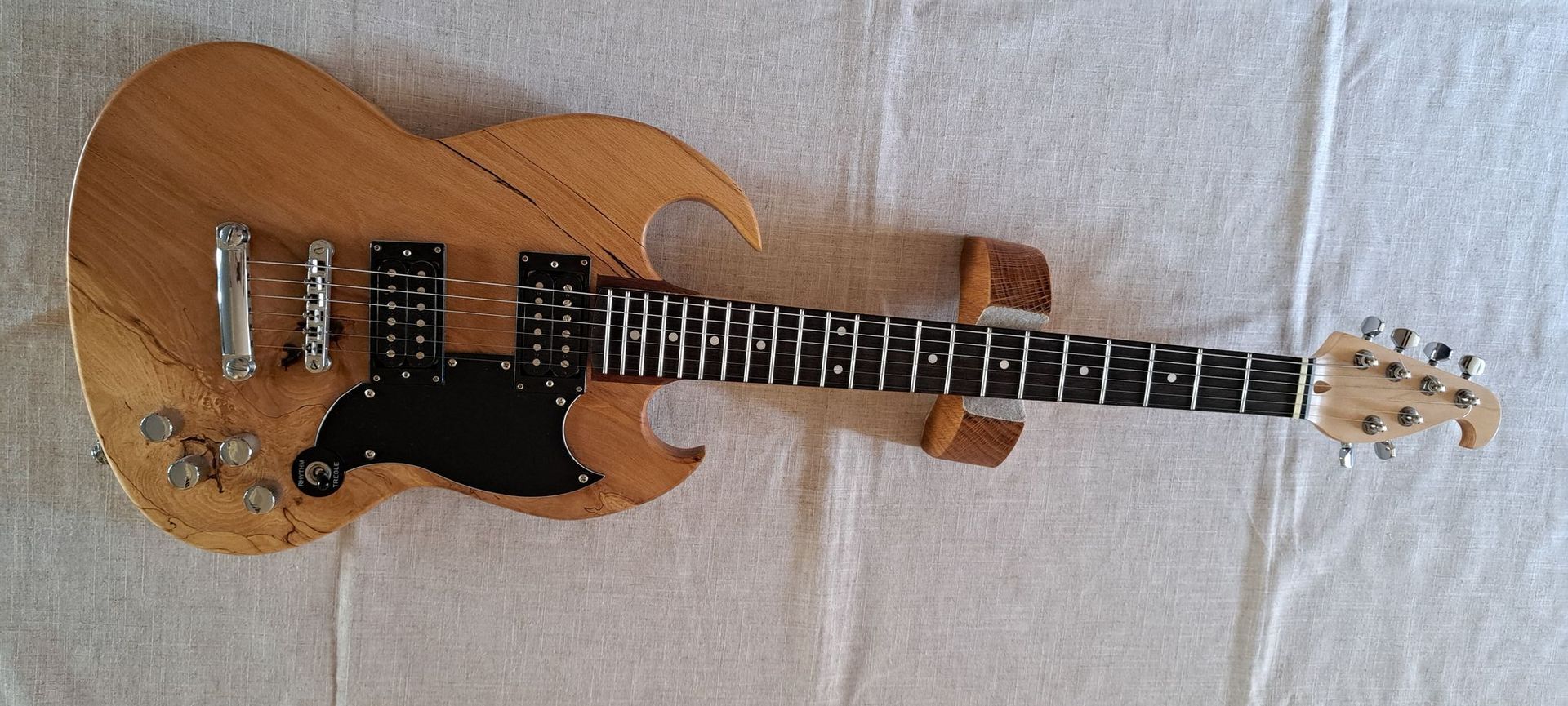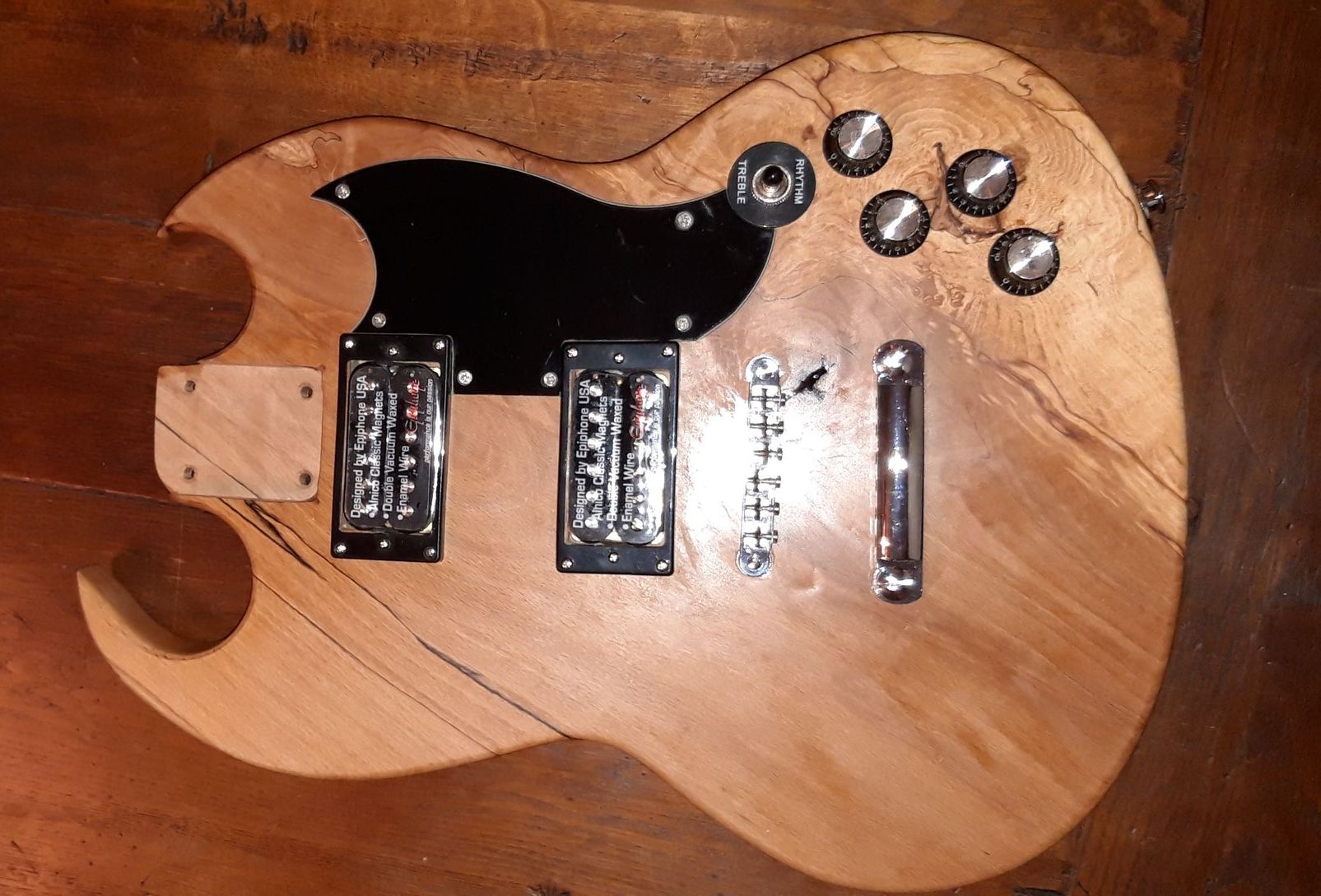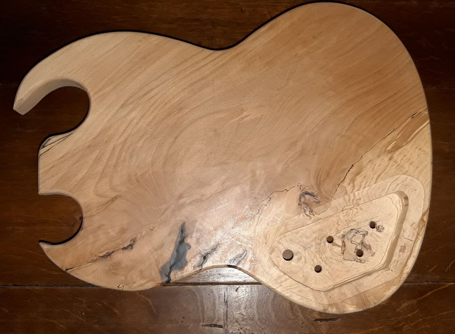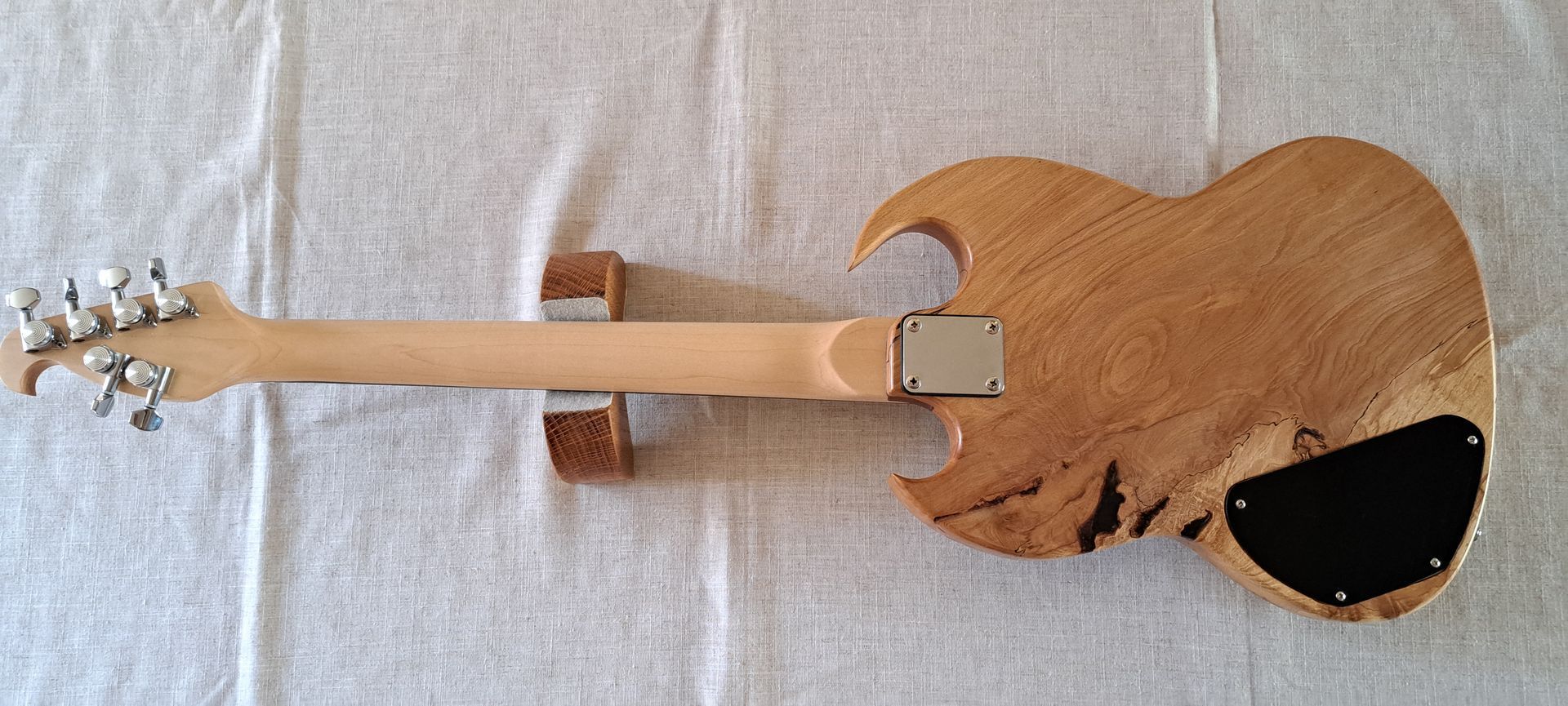The customer wanted an SG style bodied guitar of reasonable weight, and a uniquely grained/featured piece of timber for a clear finish to showcase the wood, rather than a painted or stained body.