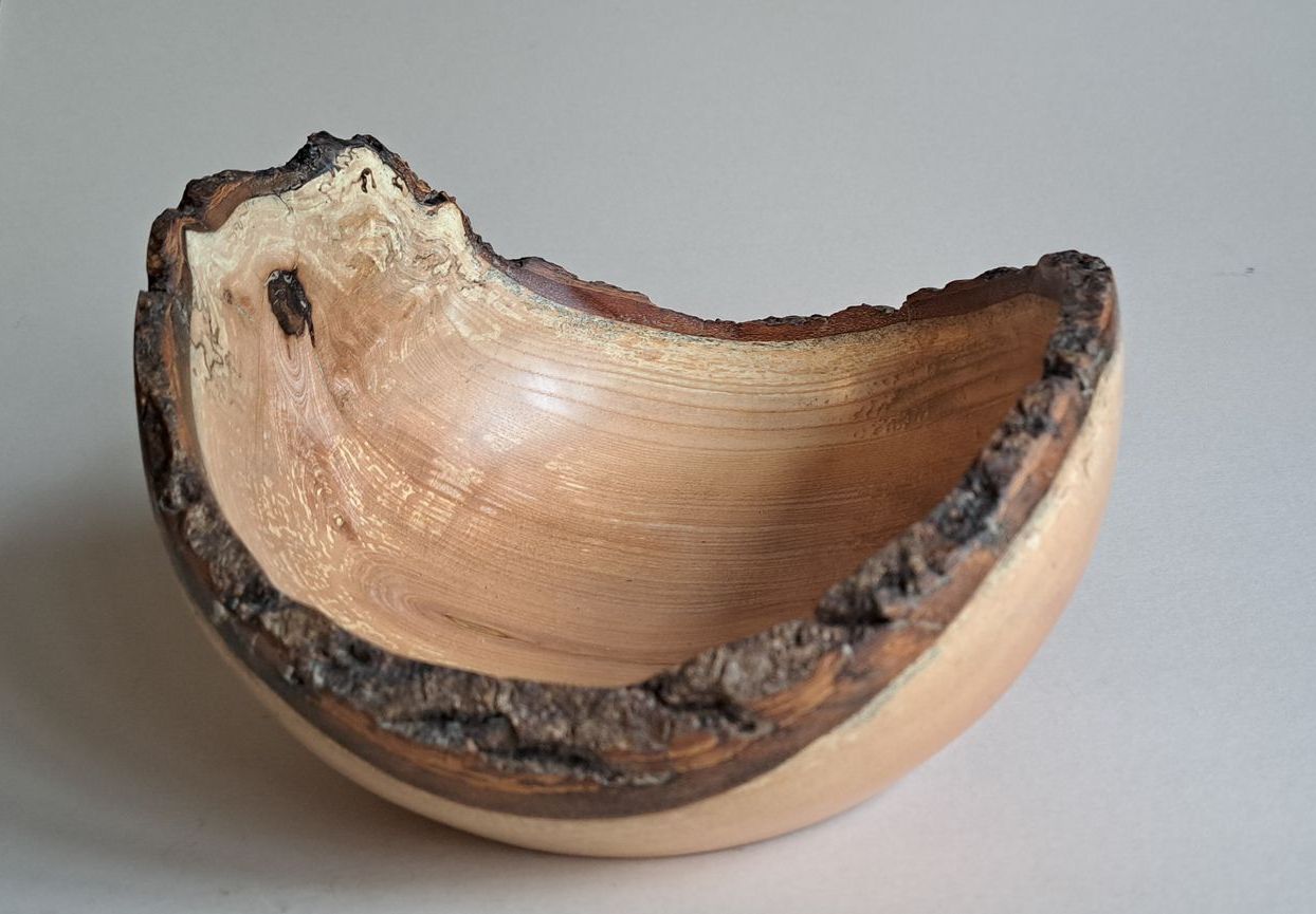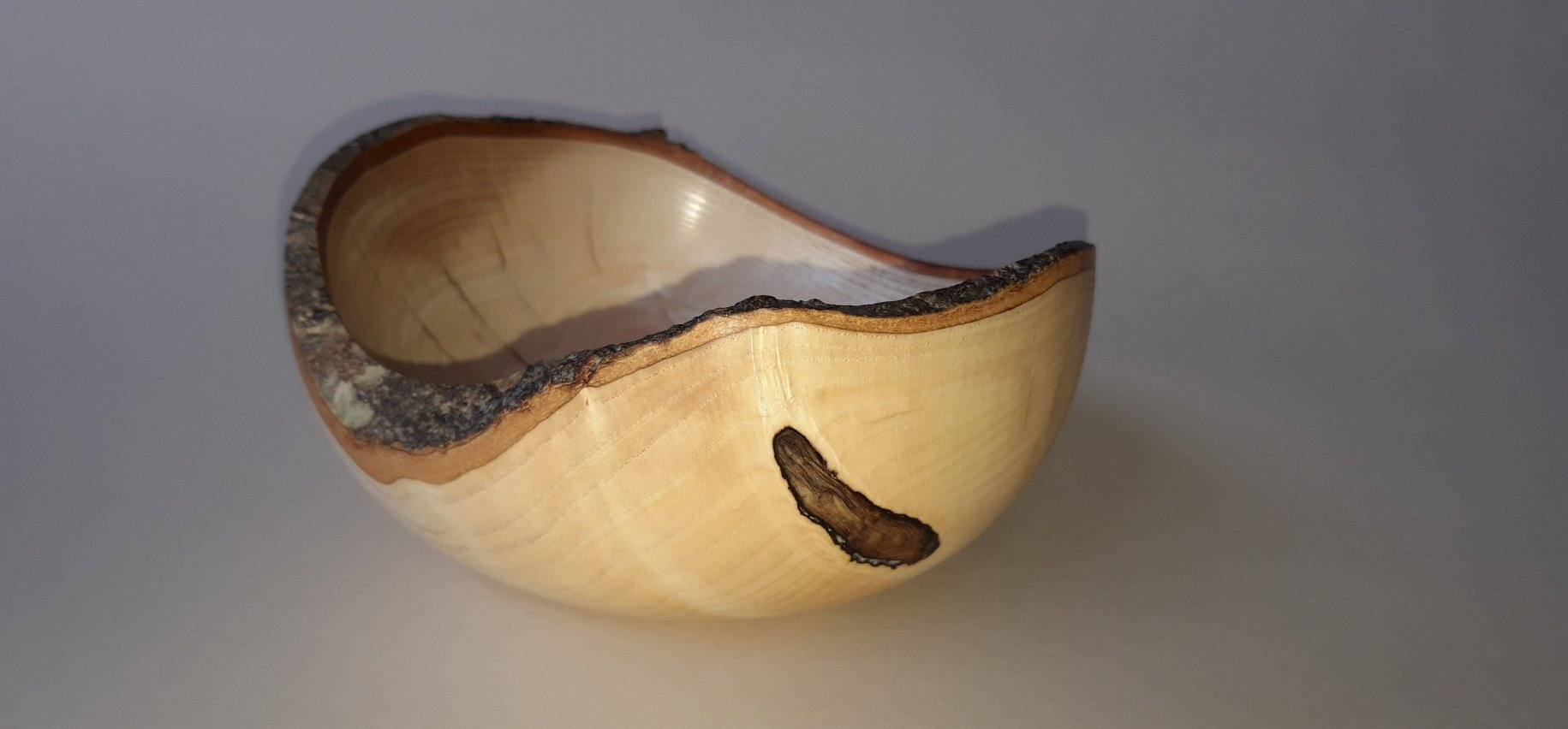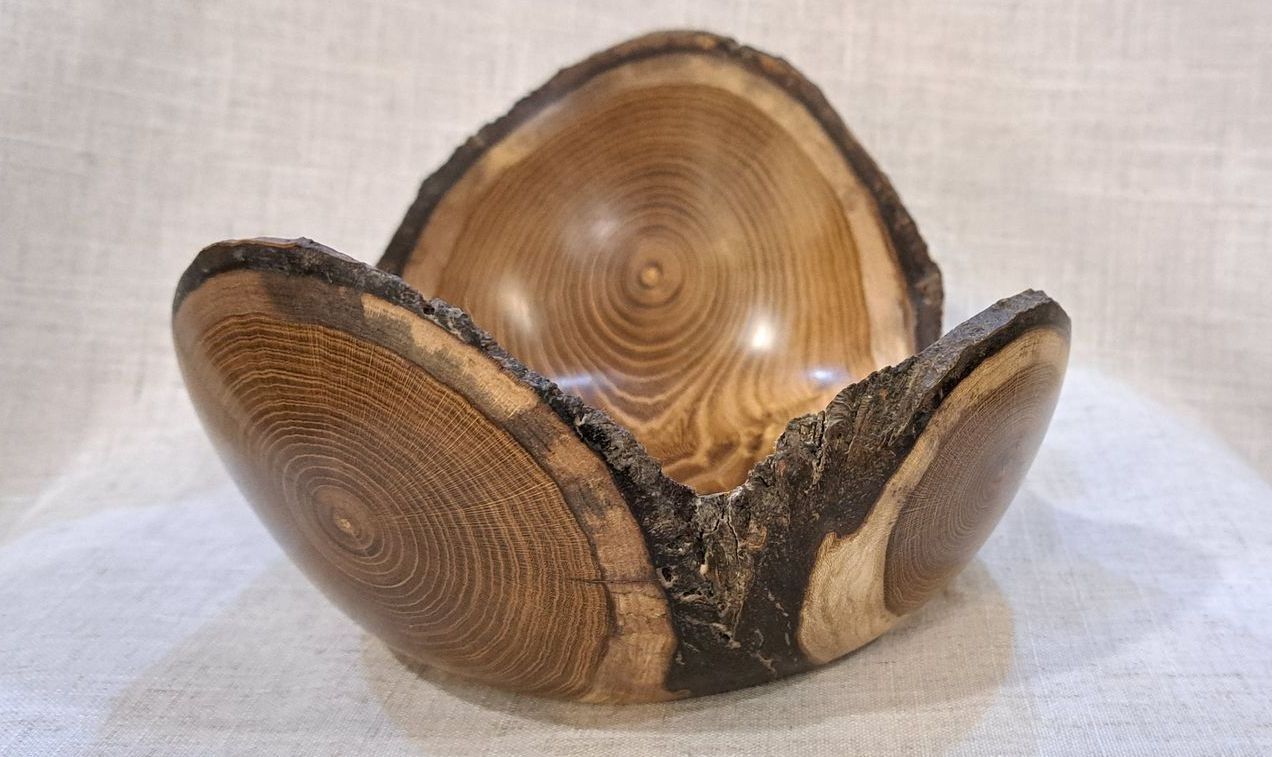 Live edged ash bowl with bark inclusion features,