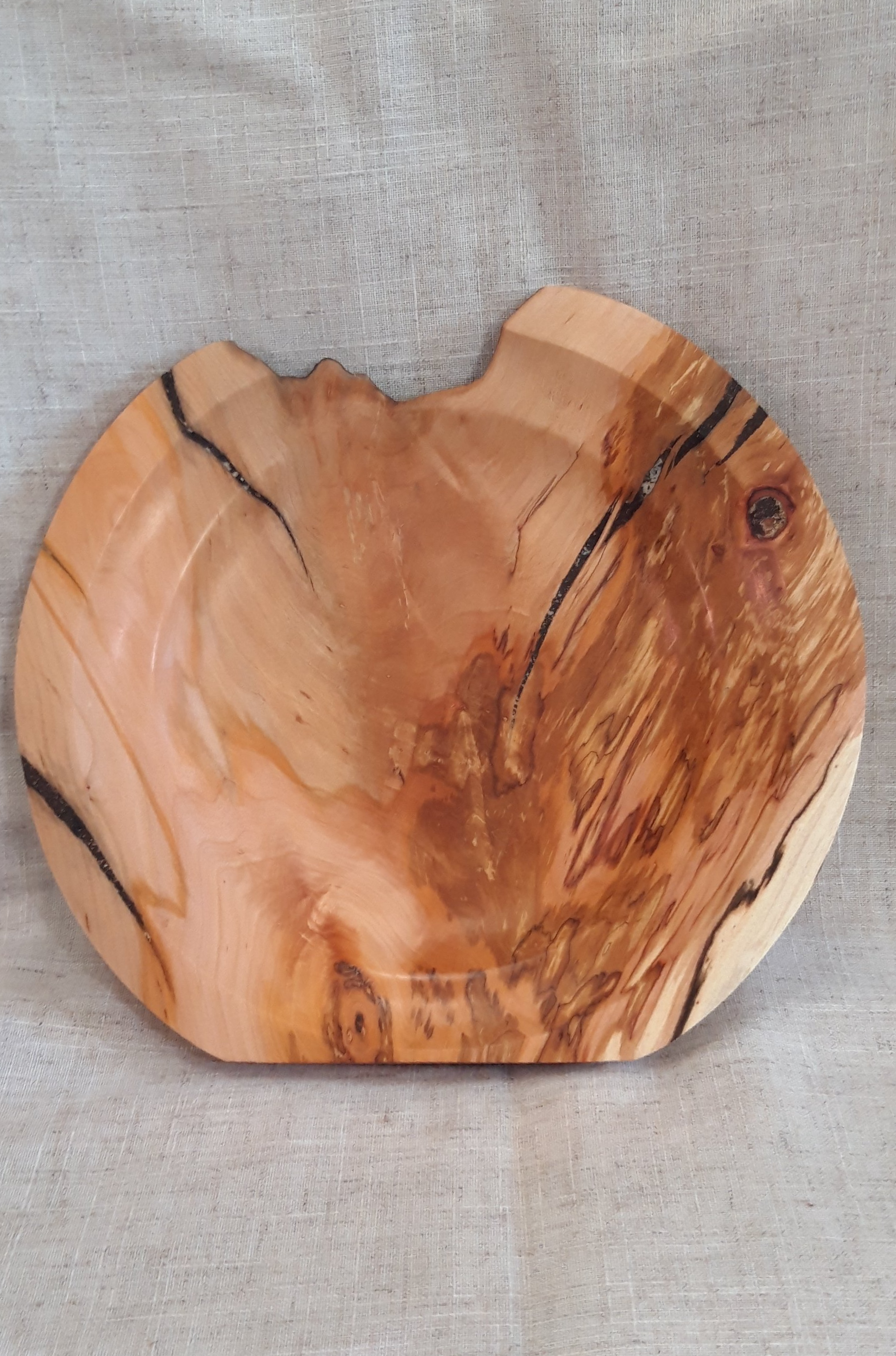 Feature-rich, live edged dish of Applewood. Natural knot hole even some beetle tracks visible where the bark has separated.