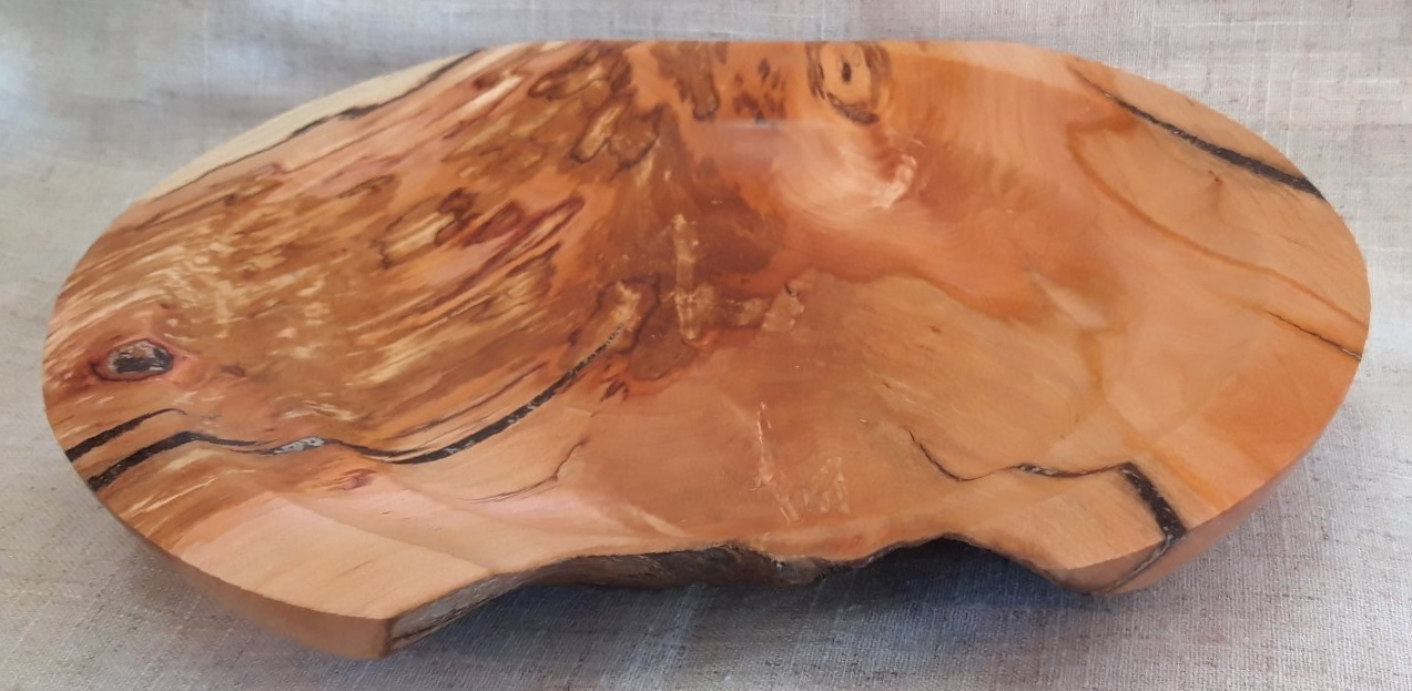 Shallow, feature-rich, live edged dish of spalted Ornamental Cherry from a friends garden in Churchdown, Cheltenham.