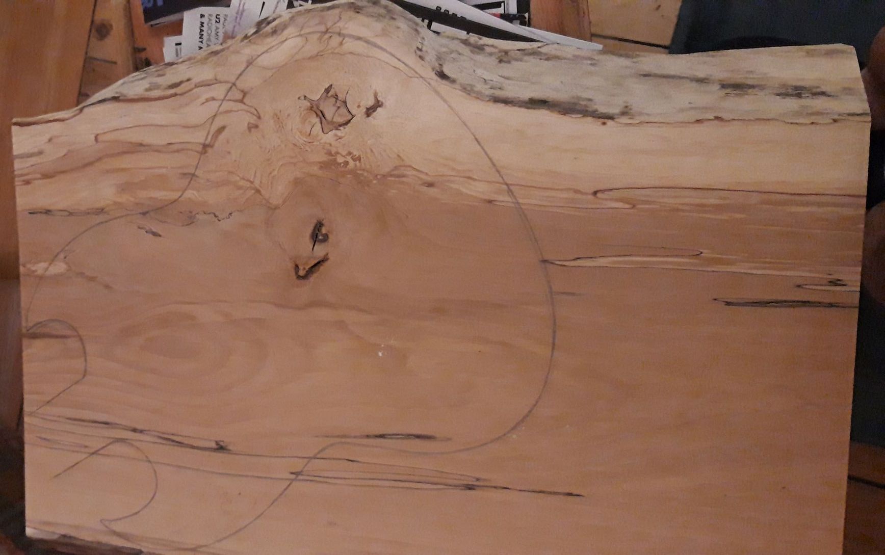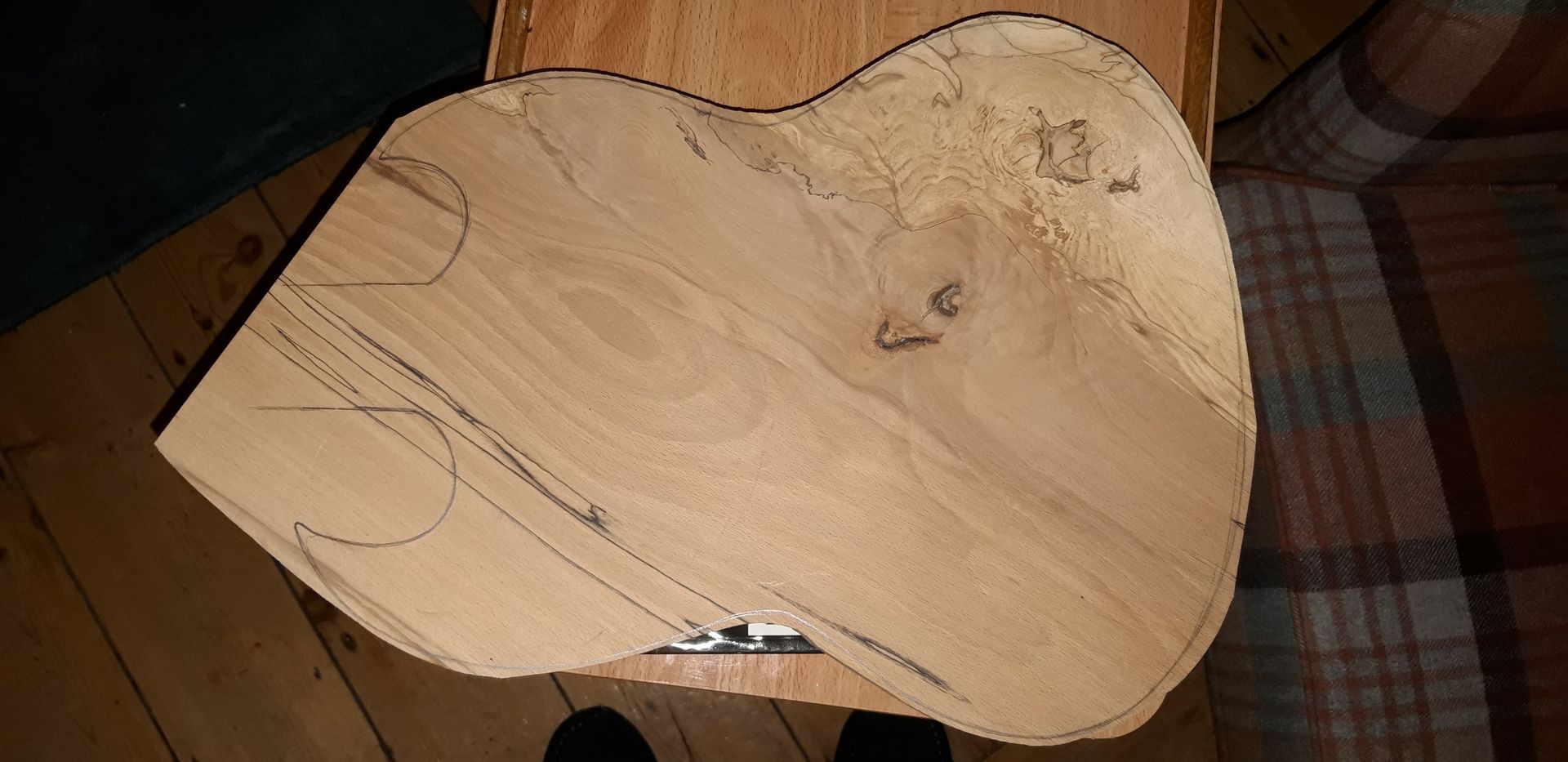 A suitable board was sourced from a small scale board producer in Devon as shown below, with a CD for scale. This is spalted beech.