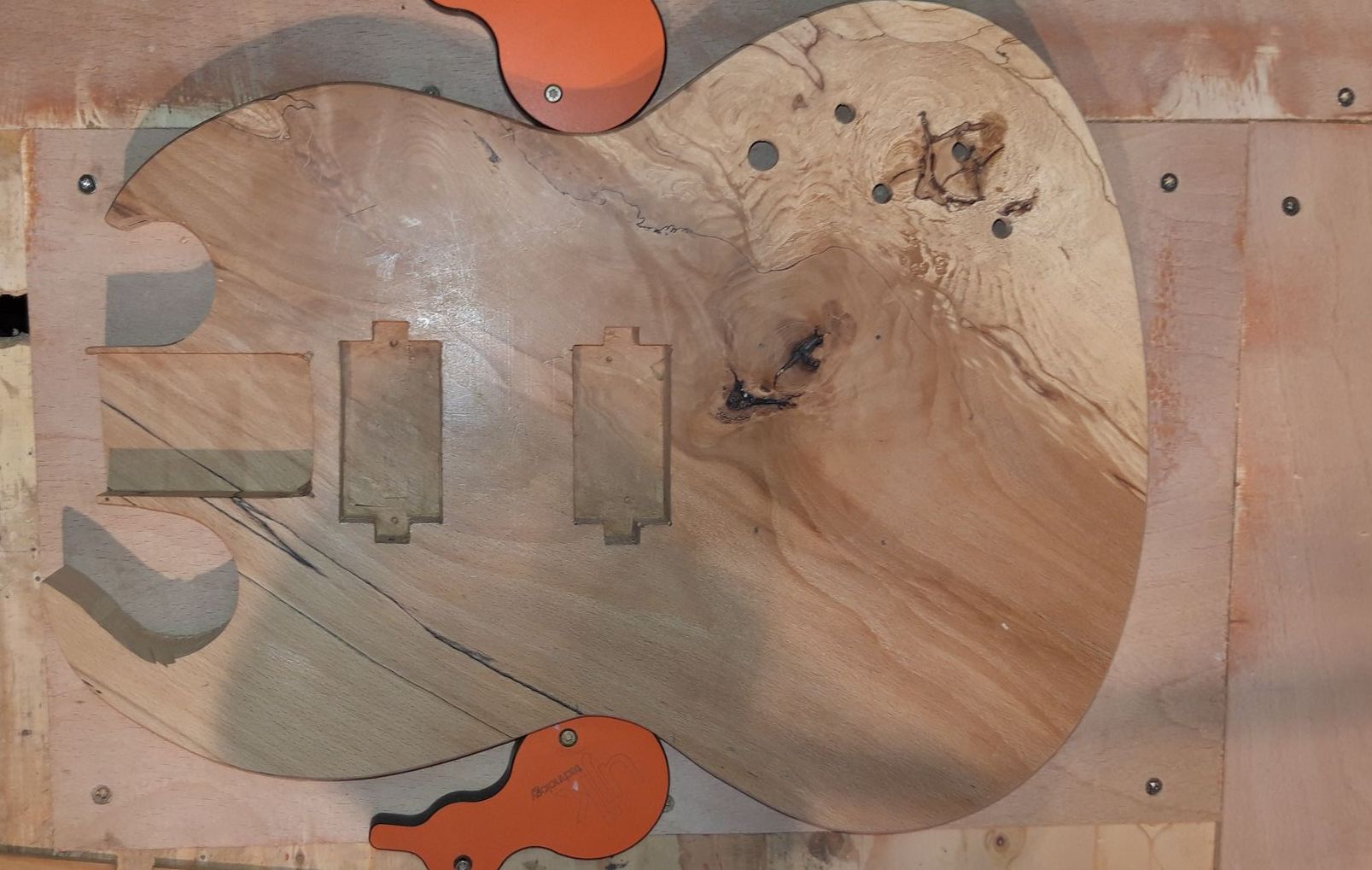 Pickup recesses and basic neck pocket routed out. Wiring loom hole drilled through from neck pocket through each pickup recess and into main electronics recess.