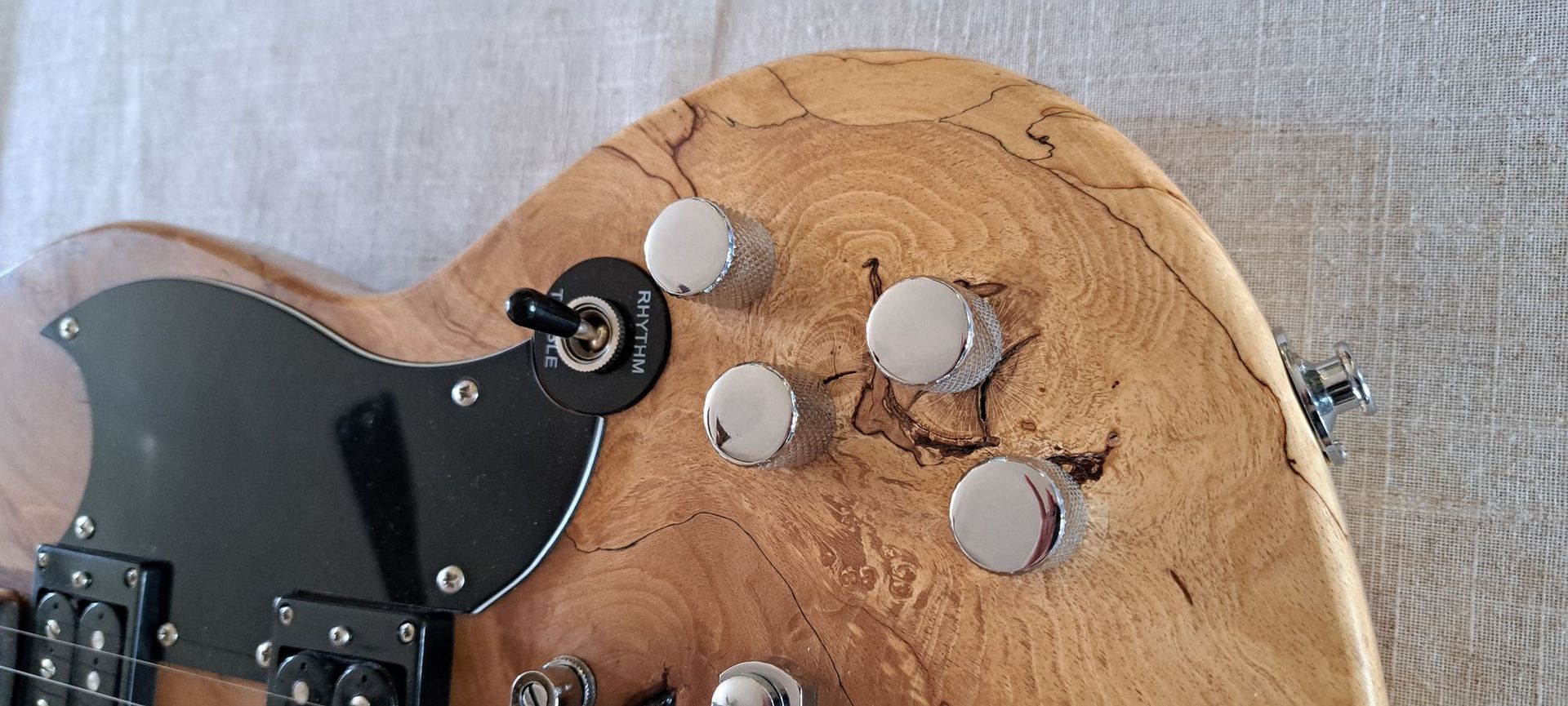 The customer wanted an SG style bodied guitar of reasonable weight, and a uniquely grained/featured piece of timber for a clear finish to showcase the wood, rather than a painted or stained body.