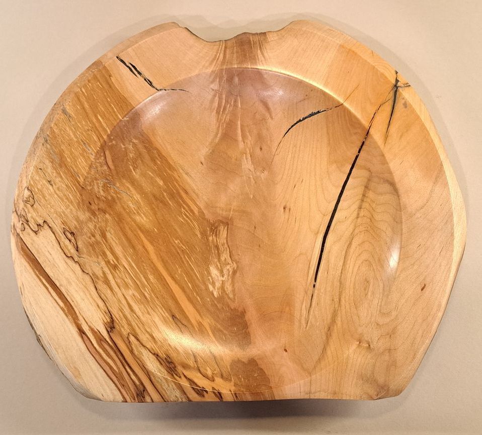 Shallow, feature-rich, live edged dish of spalted Ornamental Cherry from a friends garden in Churchdown, Cheltenham.